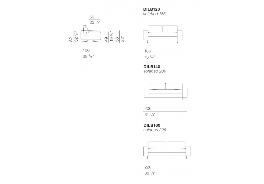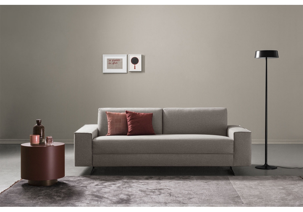 Dilbar firmato da Studio Res per Bodema é un divano letto 2-3 posti con doghe in legno e materasso Simmons a molle insacchettate, braccioli larghi e piedi alti in metallo finitura Manganese. In tessuto, pelle, velluto, trasformabile in letto piazza e mezza, francese, matrimoniale.