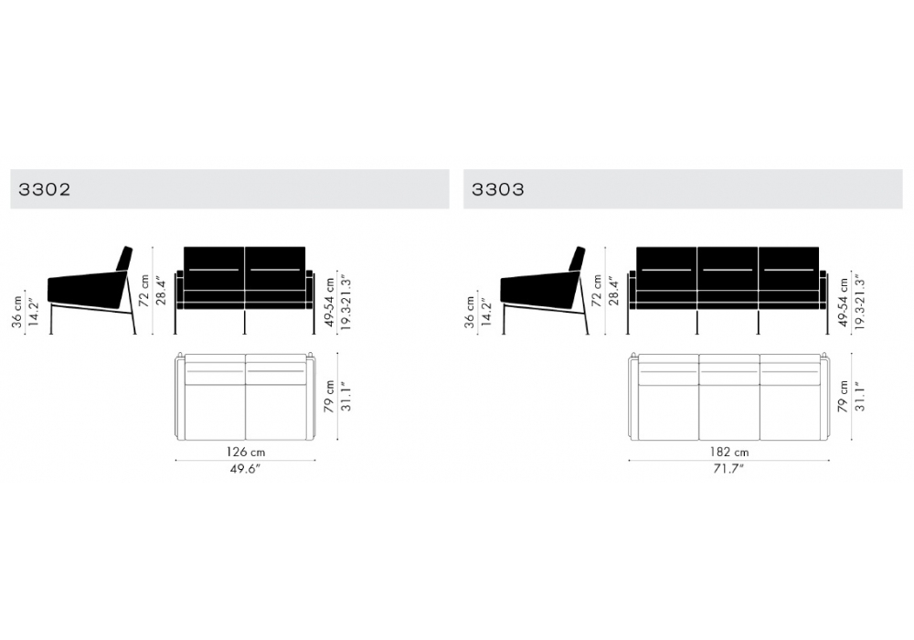 | Dimensioni | 126 x 79 x H 72 cm (3302); 182 x 79 x H 72 cm (3303). |