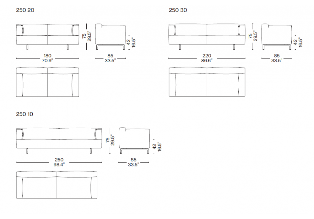 250 Met firmata da Piero Lissoni per Cassina è una collezione di imbottiti con rivestimento disponibile in tessuto o pelle. Divani in tre dimensioni, angolari, terminali di diverse larghezze e allunghi, elementi intermedi, poltrone lunghe, panca, pouf, cuscini decorativi rettangolari e quadrati. Basamento in alluminio brillantato o antracite opaco.