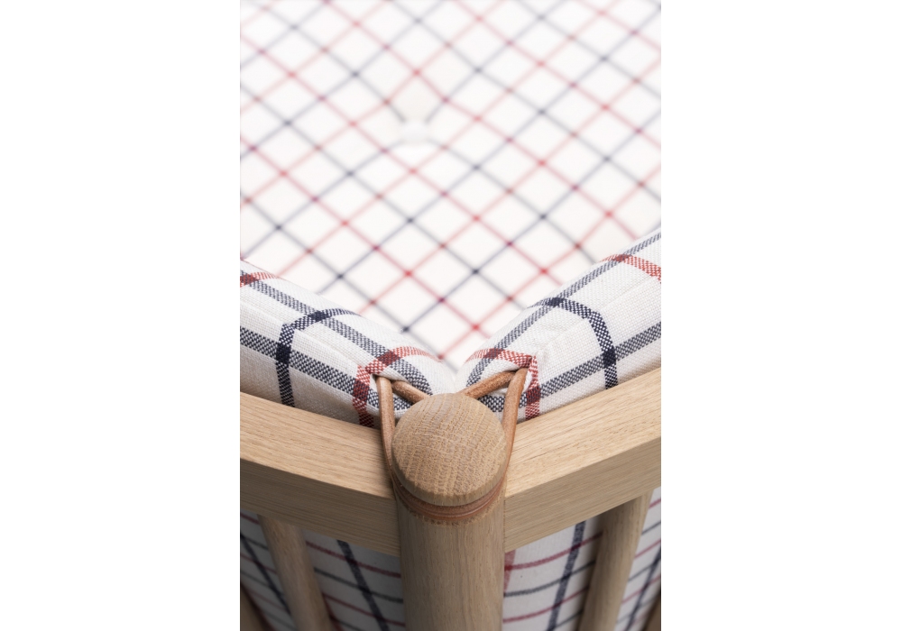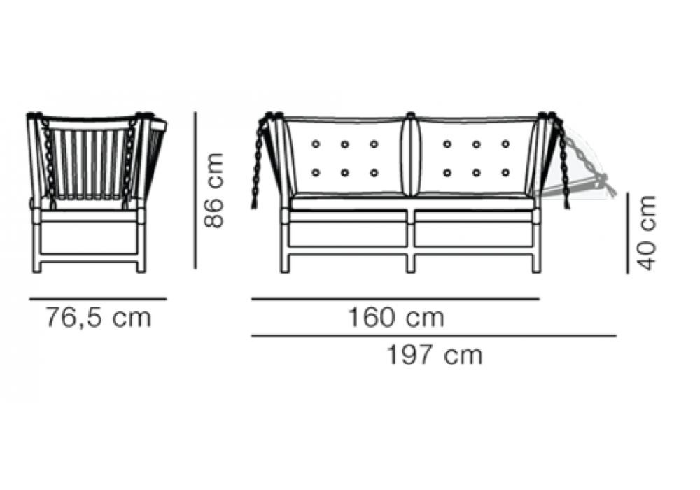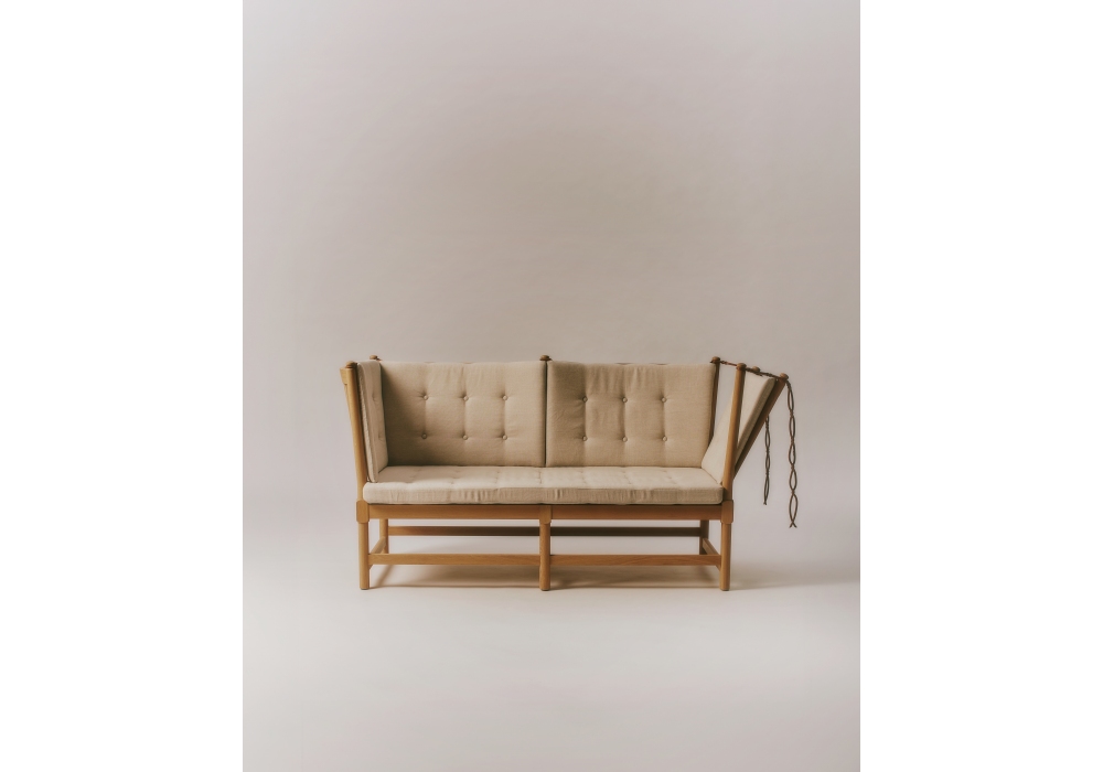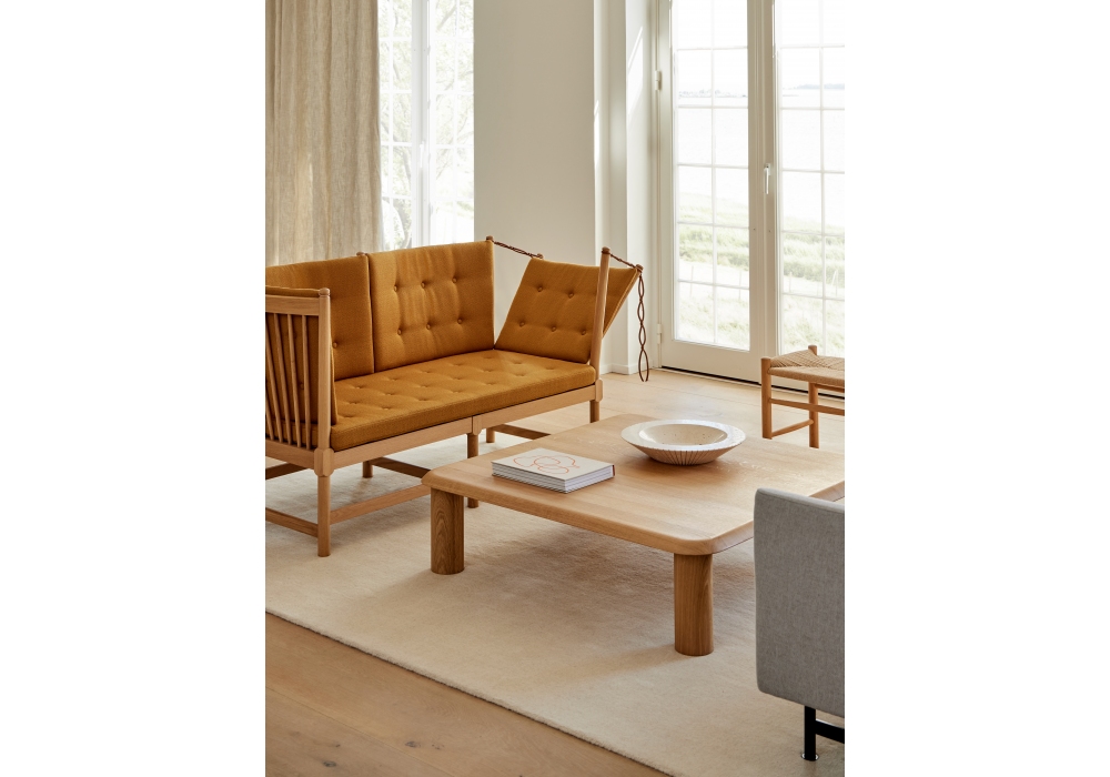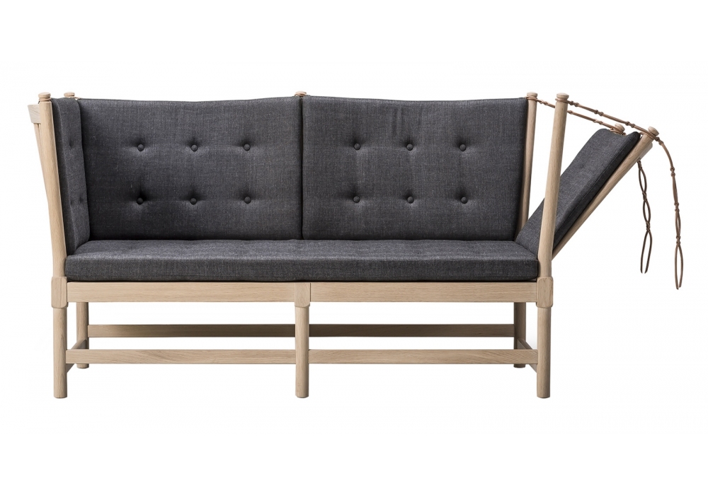 The Spoke-Back firmato da Børge Mogensen per Fredericia è un divano con struttura in legno massello di rovere. Sedile sostenuto da cinghie di juta. Cuscini di seduta e schienale intercambiabili in solida schiuma CMHR o HR, rivestiti in tessuto o pelle e rifiniti con bottoni. Chaise longue regolabile in inclinazione e sostenuta da cinghie in cuoio. Il cuscino del sedile in pelle ha il supporto in iuta.