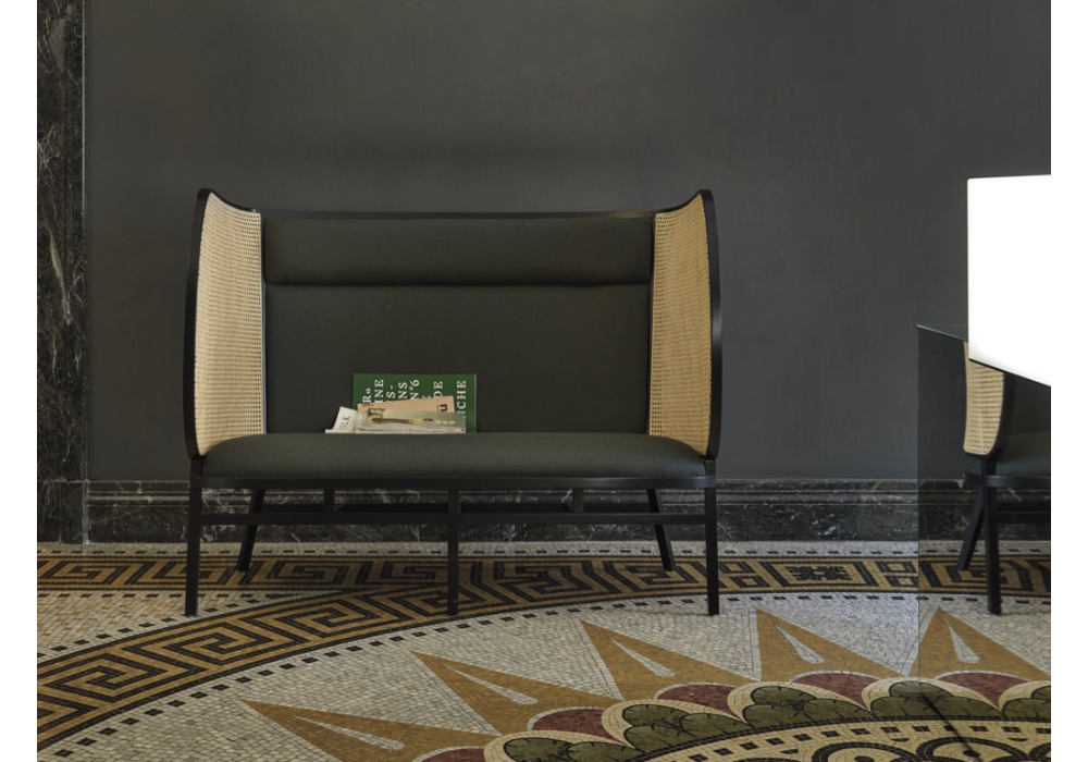 Hideout Loveseat firmato da Front per Gebrüder Thonet Vienna è un divanetto due posti in faggio curvato. Seduta e schienale imbottiti in poliuretano espanso a densità differenziata con elementi laterali in paglia di Vienna.