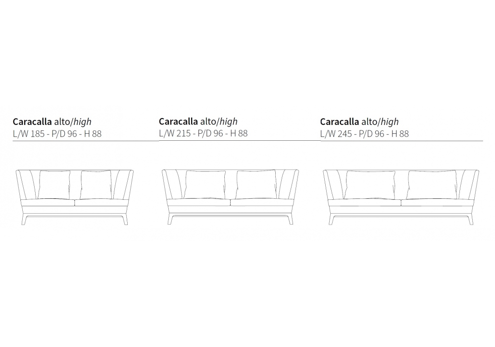 Caracalla Alto firmato da Giuseppe Casarosa per Ceccotti Collezioni è un divano con struttura interna realizzata in legno massello, base in massello di noce americano, cuscini imbottiti con poliuretano espanso non deformabile di varie densità e piuma. Disponibile in 3 dimensioni.
