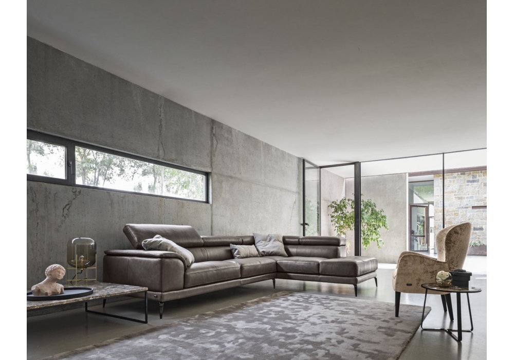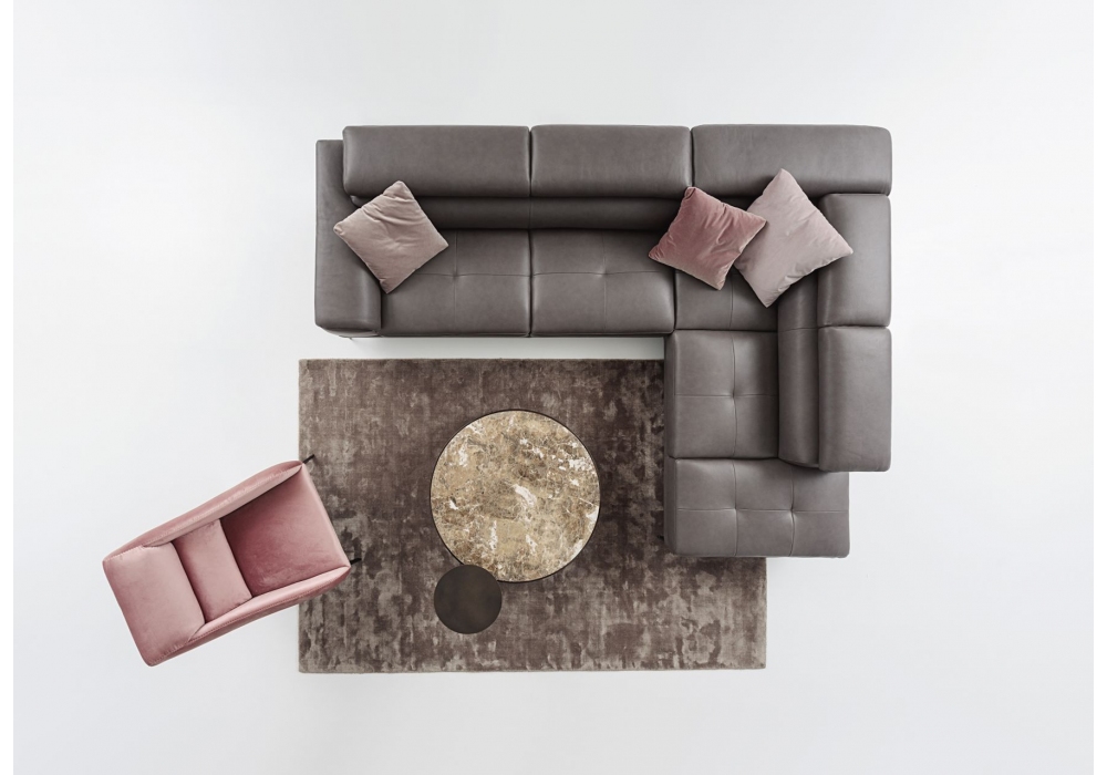 Tiziano firmato da Nicoline è un divano con struttura in legno e multistrato, molleggio seduta con cinghie elastiche. Imbottitura in poliuretano espanso rivestito di Tecnoform. Rivestimento in tessuto o pelle, cuscini non sfoderabili. Piedi in metallo lucido, satinato e canna di fucile.