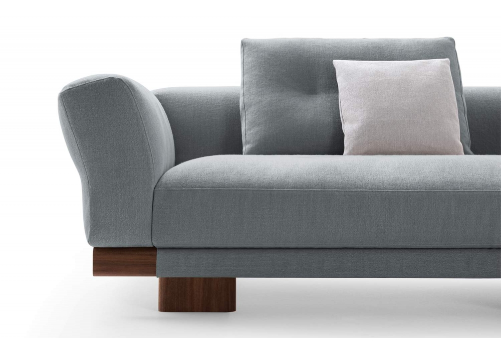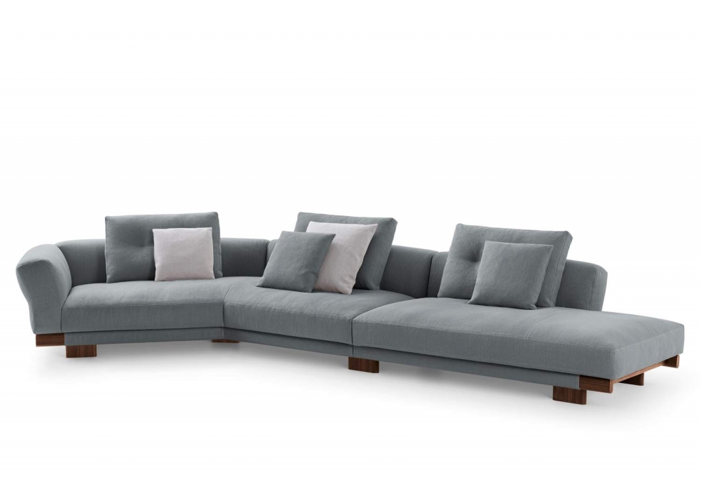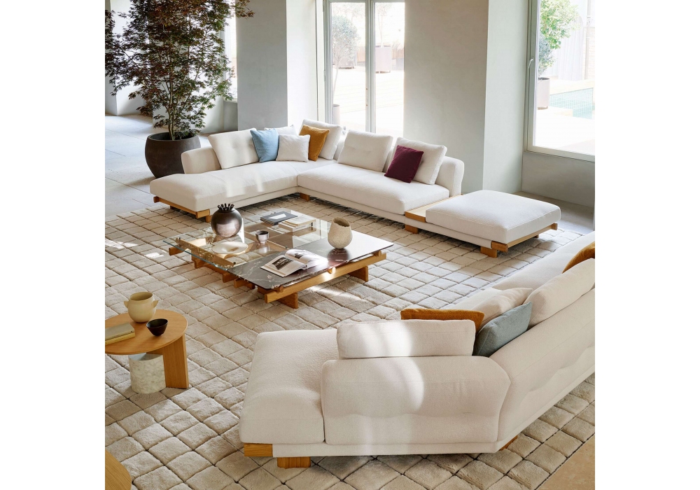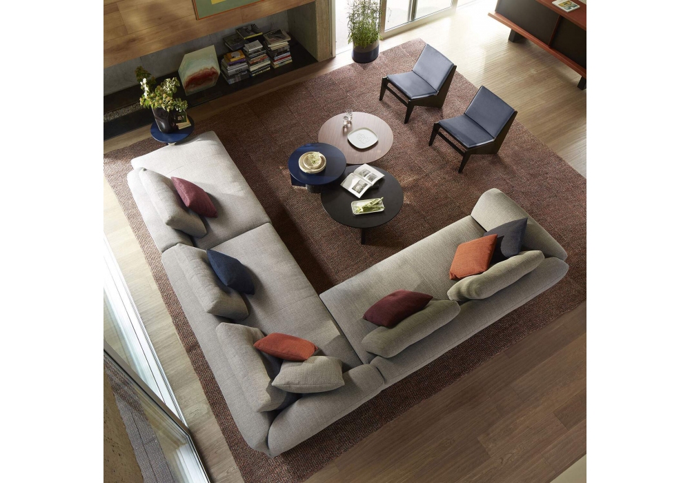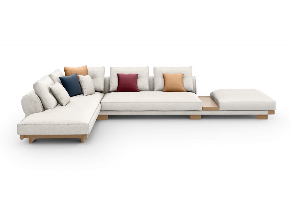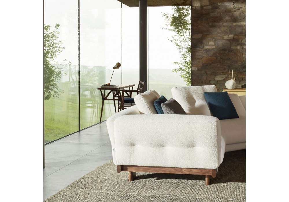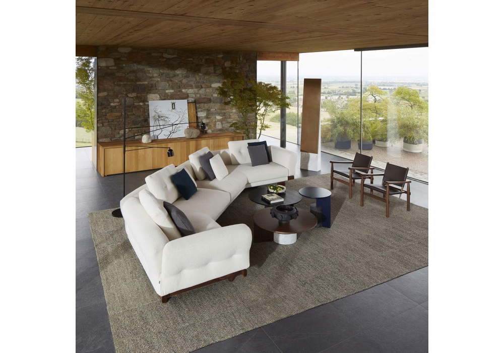 556 Sengu firmato da Patricia Urquiola per Cassina è un divano con struttura in acciaio rifinito con travi in legno e cuscini imbottiti con fibra riciclata disponibile in diverse configurazioni. Linee geometriche semplici ed è molto confortevole.