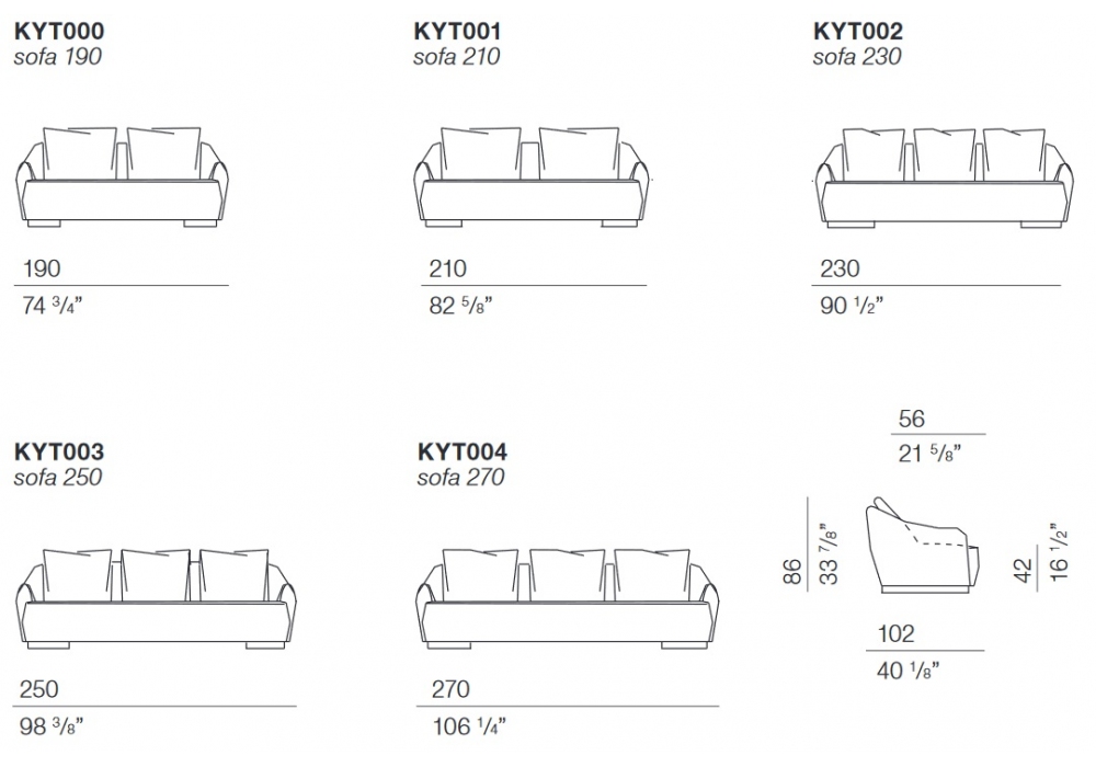| Dimensioni | 190 x 102 x H 86 cm; 210 x 102 x H 86 cm; 230 x 102 x H 86 cm; 250 x 102 x H 86 cm; 270 x 102 x H 86 cm |