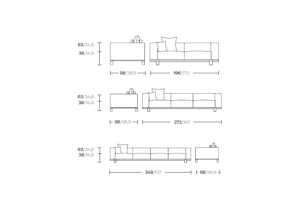 | Dimensioni | 196 x 98 x H 63 cm; 272 x 98 x H 63 cm; 348 x 98 x H 63 cm. |