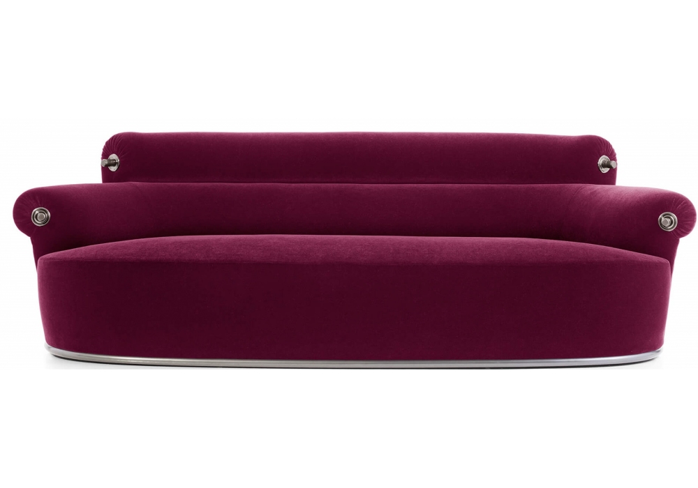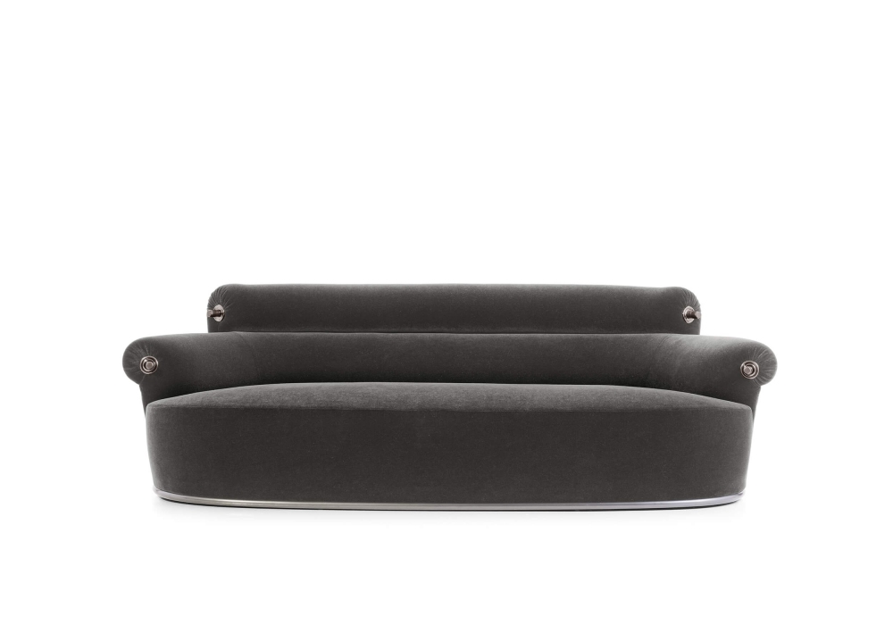Toro firmato da Luigi Caccia Dominioni per Azucena è un divano a tre posti, con rivestimento disponibile in diversi materiali. Basamento con finitura grigio metallizzato e borchie con finitura bronzata.