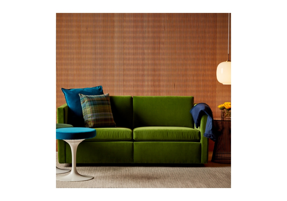 Pfister firmato da Charles Pfister per Knoll è un divano a due o tre posti con piedini in metallo e rivestimento in differenti tessuti o pelli.