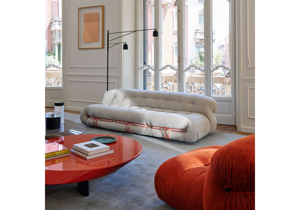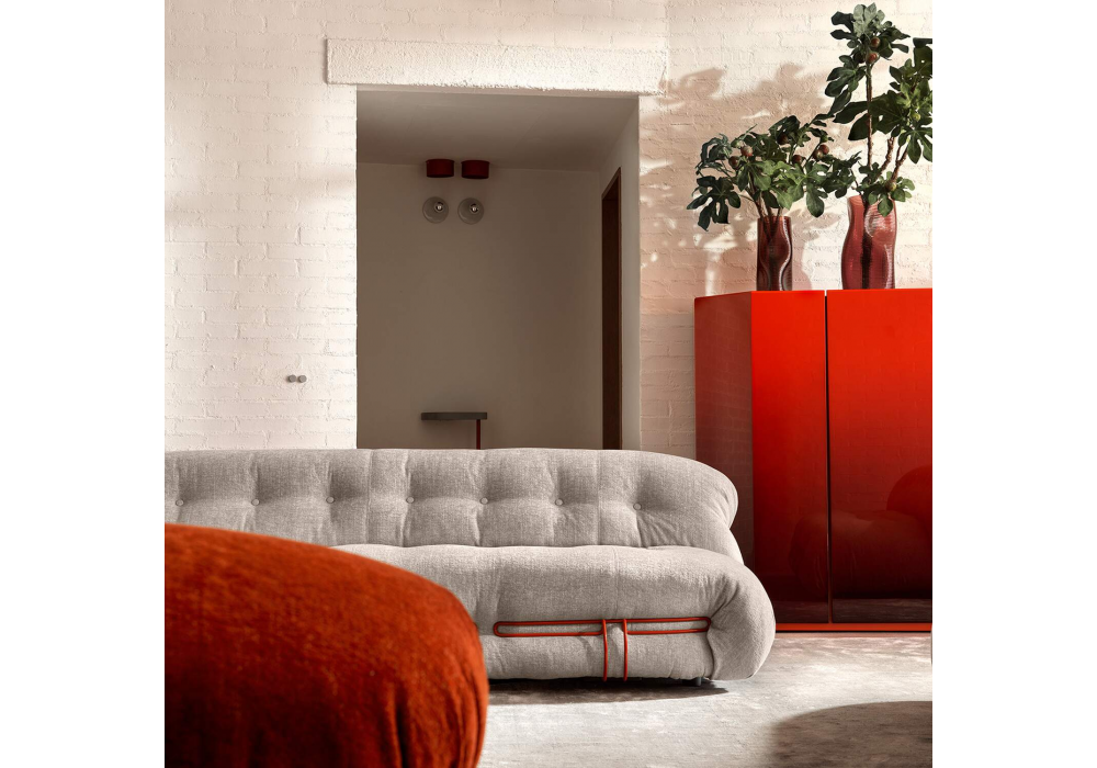 Soriana firmato da Afra & Tobia Scarpa per Cassina è un divano due/tre posti realizzato con imbottitura in ovatta o in PET 100% riciclato. Struttura in metallo verniciato e rivestimento in tessuto o in pelle. Disponibile in diverse finiture e dimensioni.