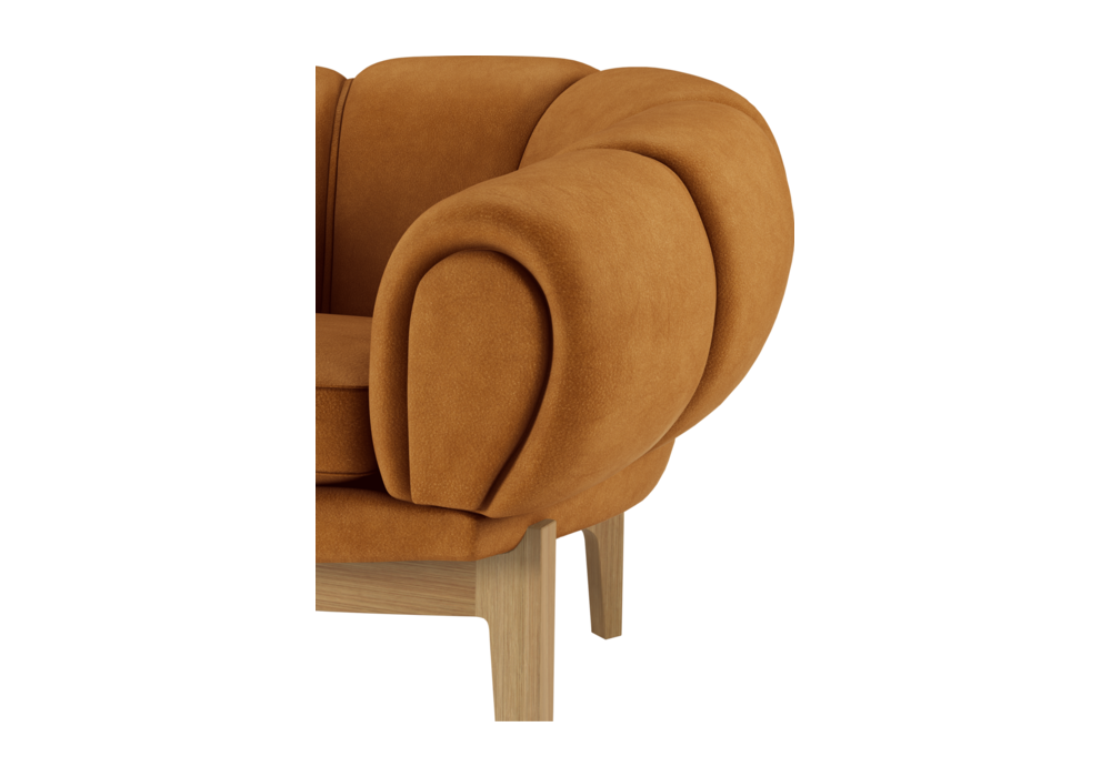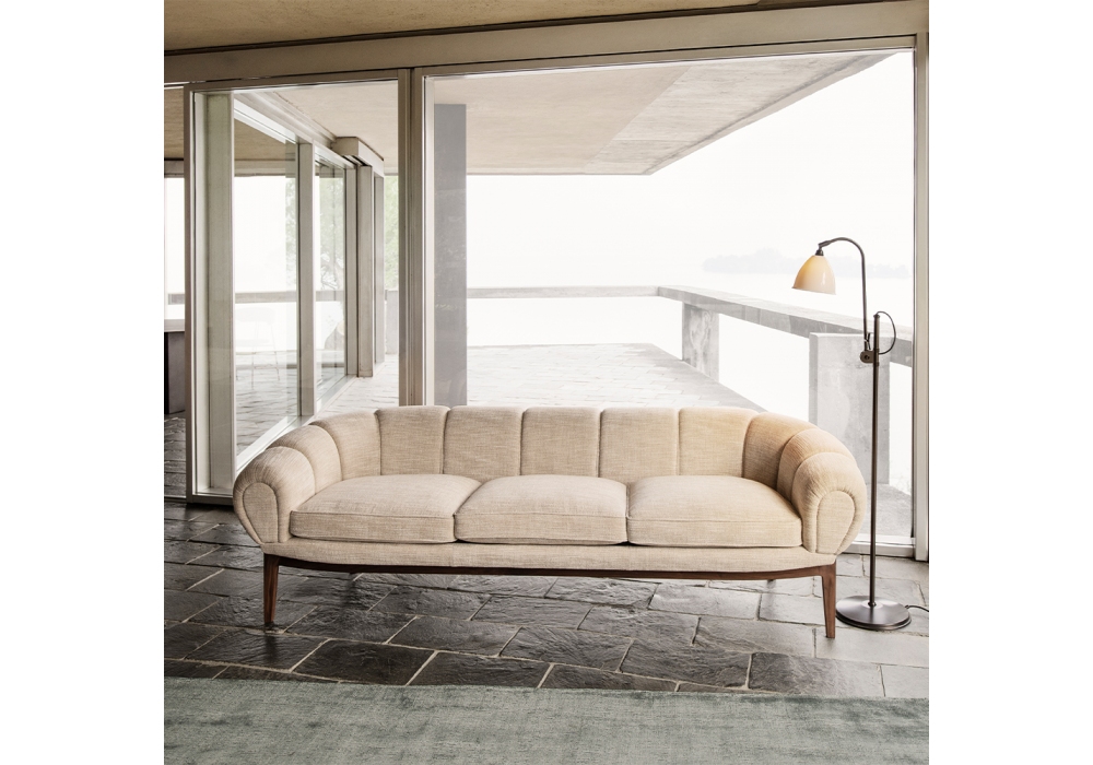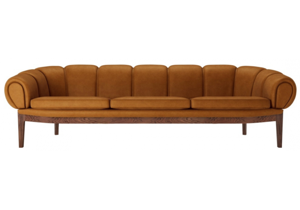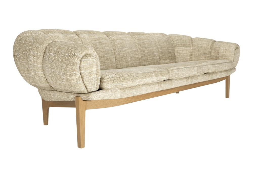 Croissant firmato da Illum Wikkelsø per Gubi è un divano completamente imbottito con base in noce americano o rovere.