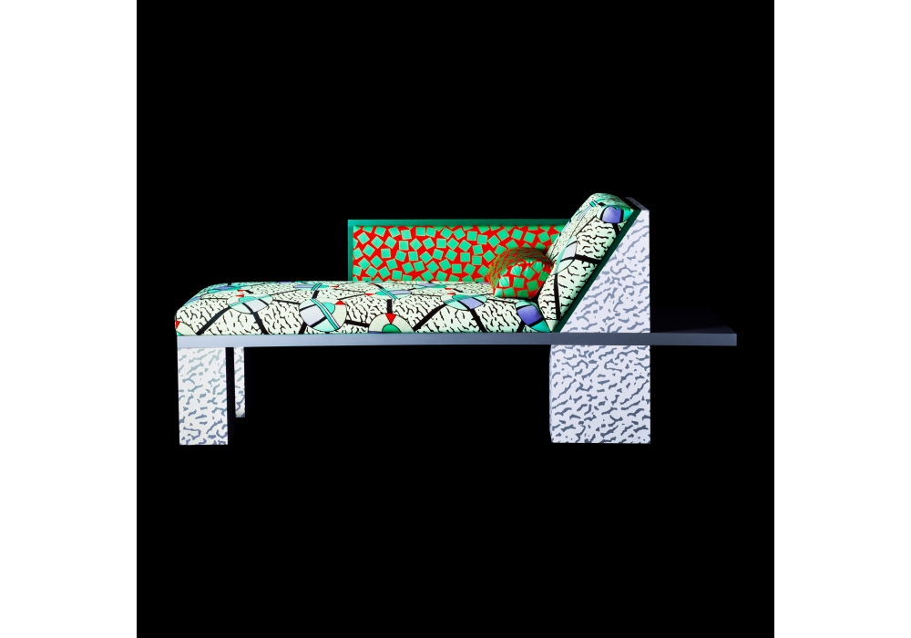 Royal firmato da Nathalie Du Pasquier per Memphis Milano è un divano in laminato plastico e tessuto in cotone. Tessuto del cuscino e del poggiabraccia disegnato da George J. Sowden.