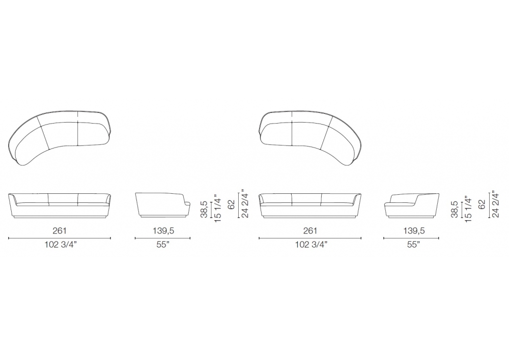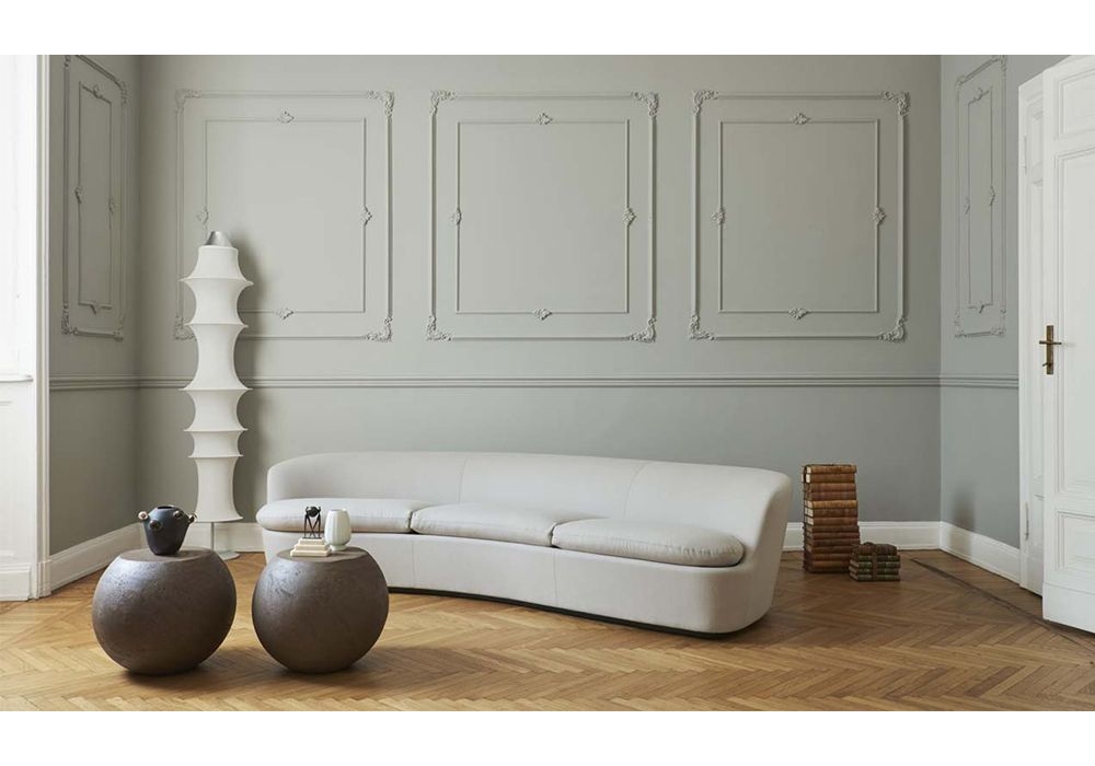 Orla firmato da Jasper Morrison Cappellini è un divano curvo realizzato con imbottitura in poliuretano espanso a quote differenziate e fibra, base in pannello in conglomerato di legno a media densità e rivestimento fisso in tessuto o in pelle.