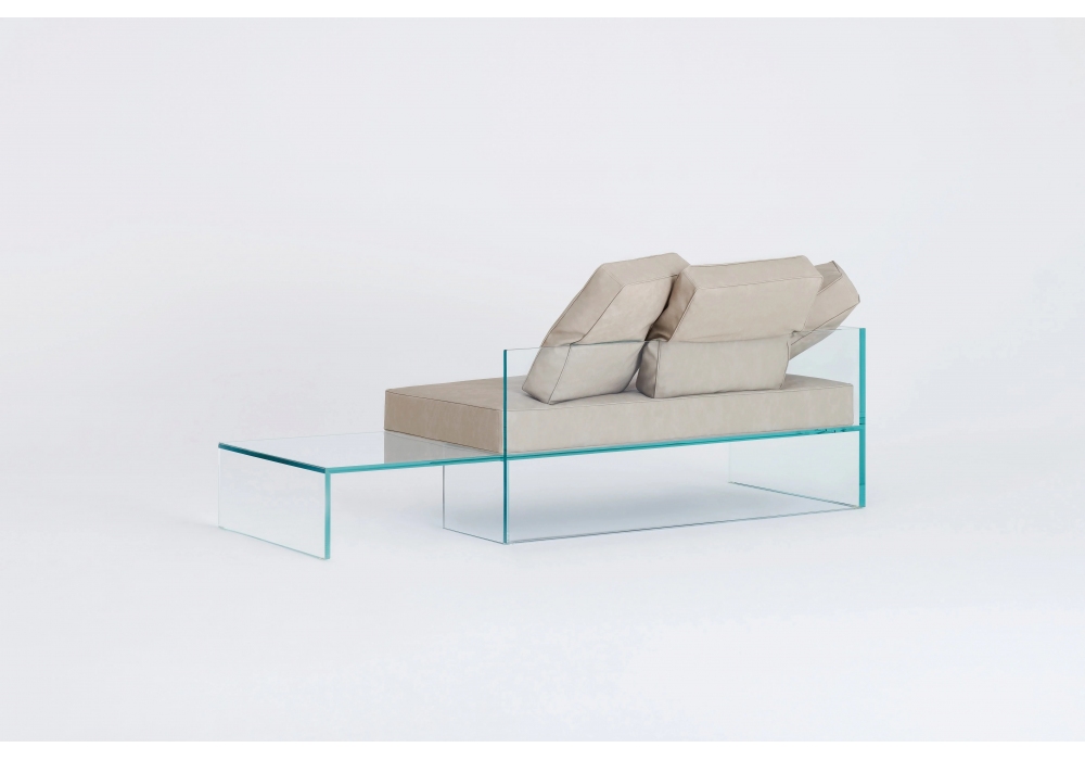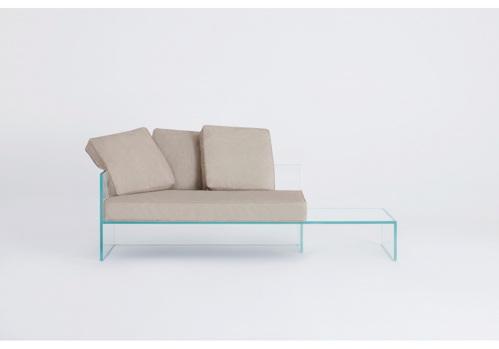 Tête-à-Tête firmato da Piero Lissoni per Glas Italia è un divano con struttura in cristallo trasparente extralight mm 19 sagomato, temperato e assemblato con incollaggi UV. La struttura è rivestita da soffici cuscini, sfoderabili e disponibili in vari tessuti o ecopelle di diversi colori. L’imbottitura è realizzata in materiale anallergico, cruelty free ed eco-compatibile, ottenuto riciclando plastiche raccolte dagli oceani. Sono disponibili due versioni: una con tavolino laterale integrato nella seduta (a destra o a sinistra), l’altra a doppia seduta contrapposta.