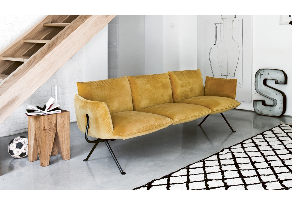Officina firmato da Ronan & Erwan Bouroullec per Magis è un divano con struttura in ferro forgiato, zincato a caldo o verniciato poliestere. Cuscino in poliuretano espanso ignifugo rivestito in tessuto o pelle. Disponibile nella versione a due o tre posti, nelle diverse finiture.