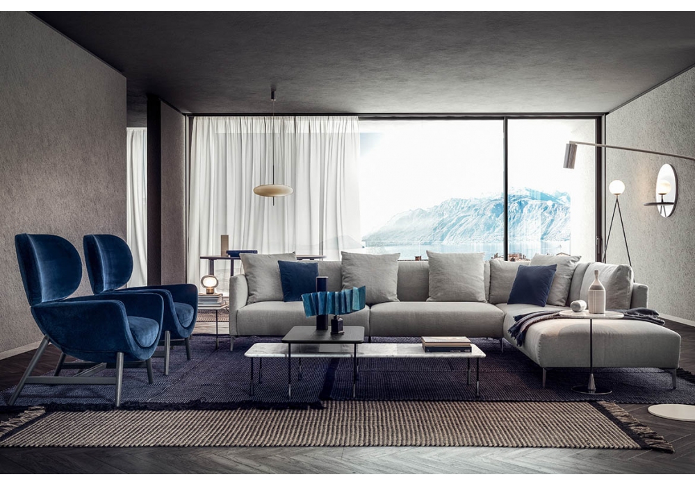 Volo firmato da Pianca è un divano realizzato con struttura interna con elementi in legno massello e con pannelli ad alta densità imbottiti in poliuretano espanso a densità differenziata, piano di seduta dotato di molleggio a cinghie elastiche differenziate e piedi in lega di alluminio verniciati. Rivestimento in tessuto, in pelle o in pelle sintetica sfoderabile.