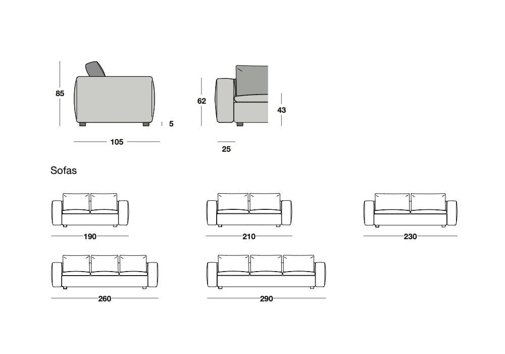 | Dimensioni | - 190 x 105 x H 62 cm; - 210 x 105 x H 62 cm; - 230 x 105 x H 62 cm; - 260 x 105 x H 62 cm; - 290 x 105 x H 62 cm. |