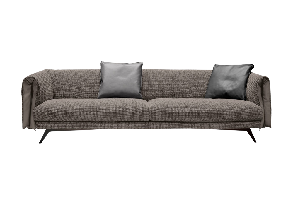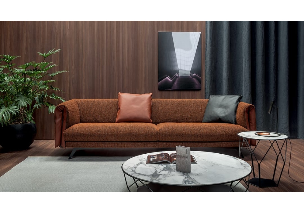Saddle firmato da Giuseppe Viganò per Bonaldo è un divano modulare con rivestimento sfoderabile in tessuto, in diverse finiture. L'inserto del bracciolo centrale è in pelle Ponza mentre quello del bracciolo perimetrale è nella stessa finitura del rivestimento. I piedi, in metallo verniciato opaco, sono disponibili con forma sagomata o conica. Disponibile in numerose composizioni.