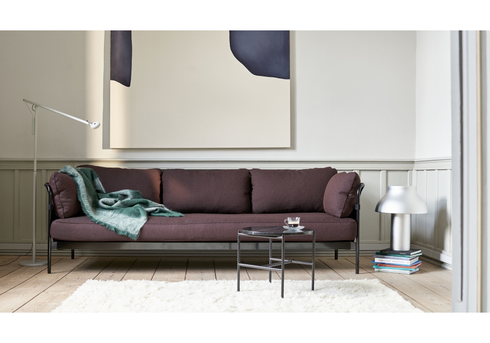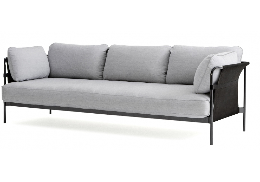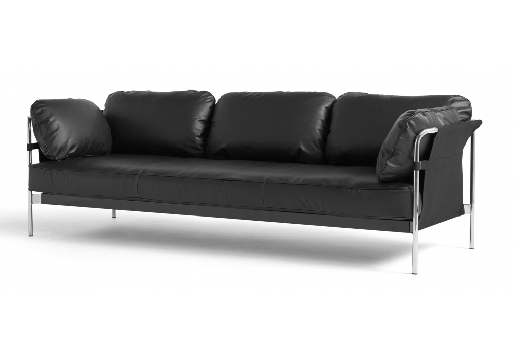 Can 3 Seater firmato da Ronan & Erwan Bouroullec per Hay è un divano a 3 posti con struttura in acciaio cromato o verniciato a polvere nera, tela esterna nella finitura naturale o nera e rivestimento in pelle o tessuto. Disponibile in differenti rivestimenti.