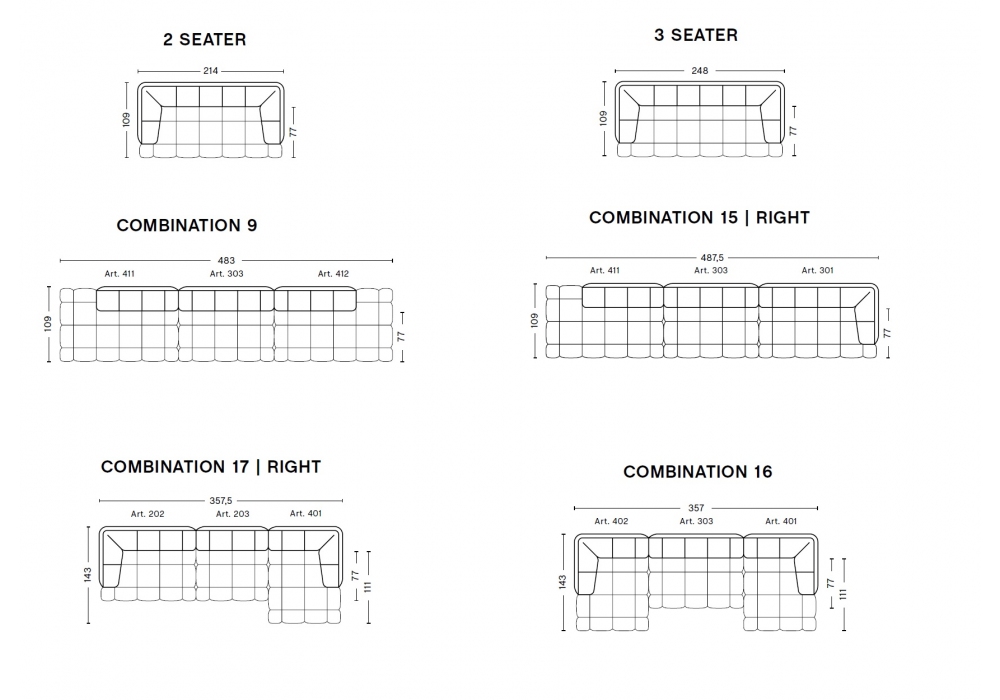 | Dimensioni | 214 x 72 x H 109 cm; 248 x 109 x H 72 cm; 426 x 109 x H 72 cm; 483 x 109 x H 72 cm; 487.5 x 109 x H 72 cm; 357 x 143 x H 72 cm; 357.5 x 143 x H 72 cm. |
