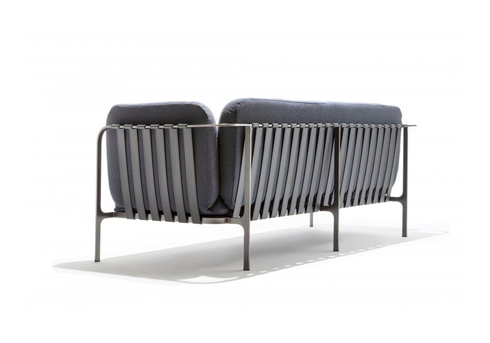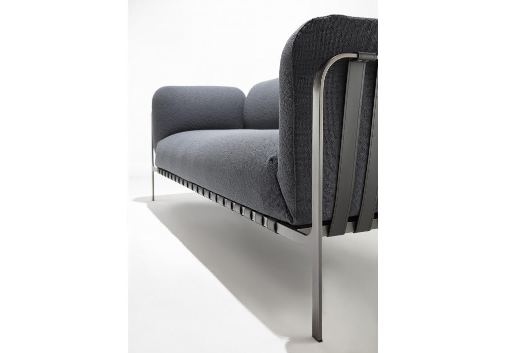 Sydney firmato da RedCreative per Enrico Pellizzoni è un divanetto con struttura in metallo verniciato con cinghie in cuoio. Seduta imbottita. Rivestimento disponibile in diversi materiali e colori. Sedile in multistrato e sottosedile rivestito in tessuto.