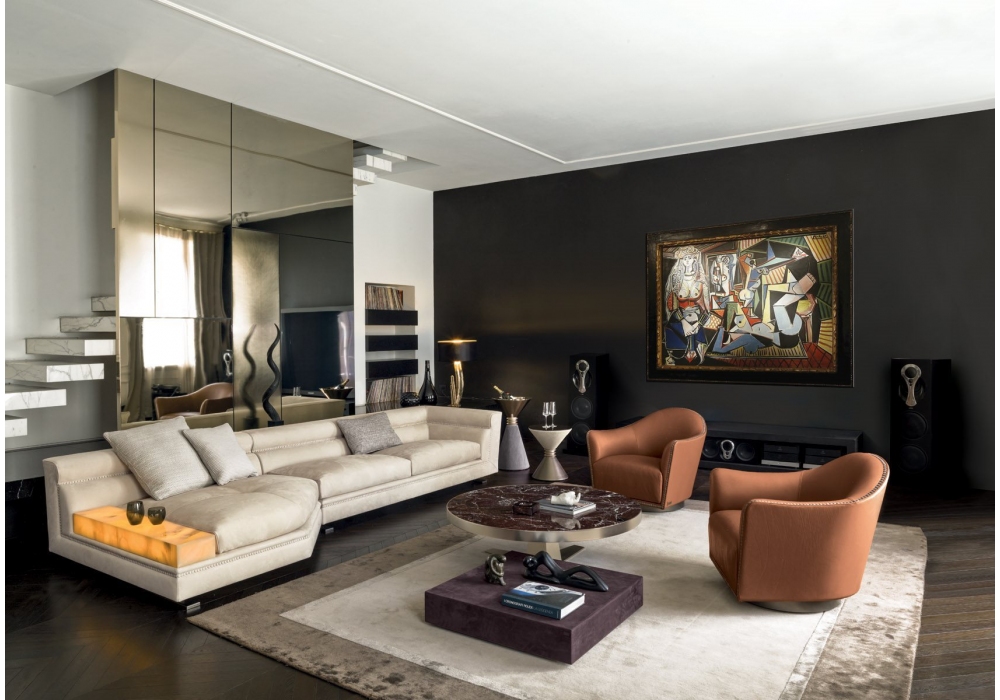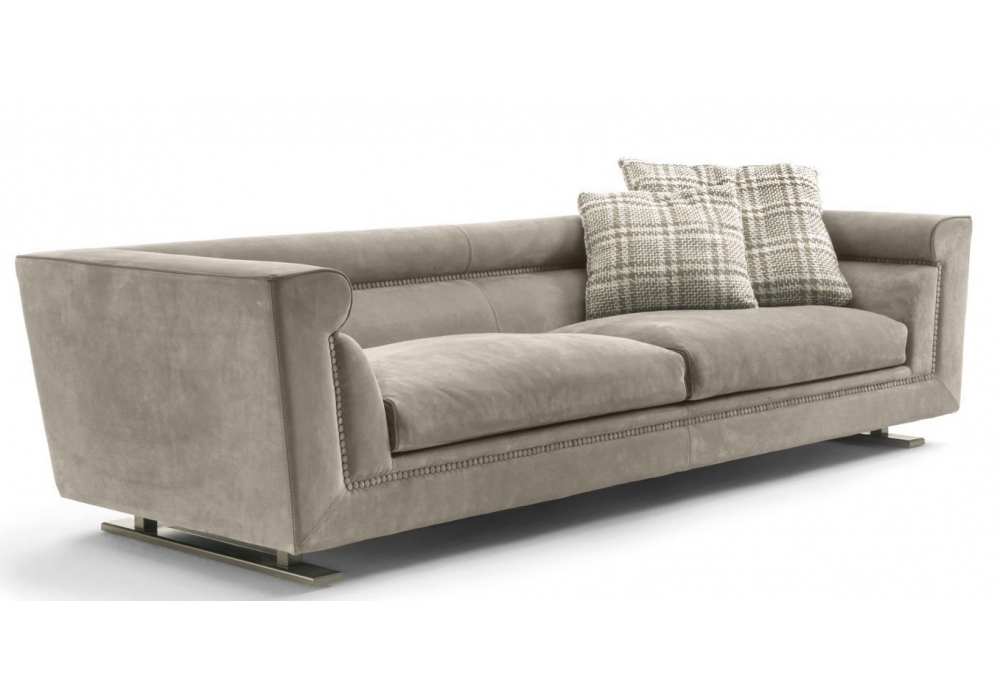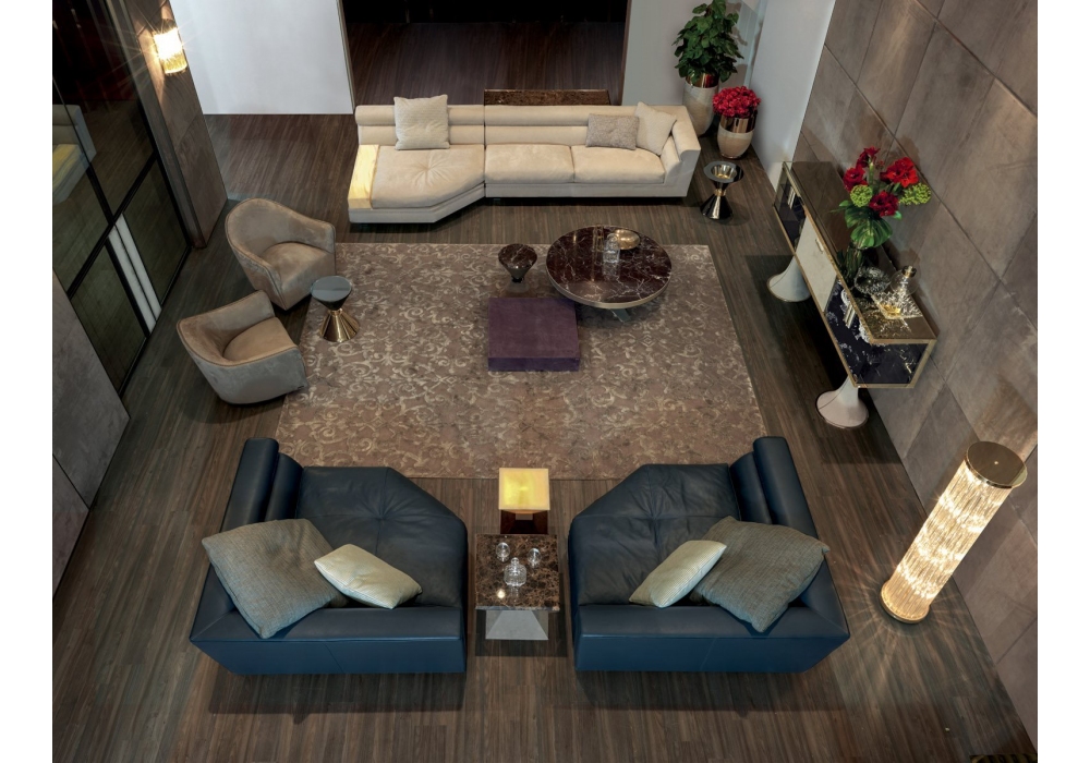 Ansel firmato da Giuseppe Viganò per Longhi è un divano componibile rivestito in tessuto o pelle non sfoderabile, ad eccezione del cuscino seduta. Bottoni a vista posizionati manualmente in diverse finiture. Cuscini di seduta in piuma d’oca sterilizzata, con inserto in poliuretano espanso a quote differenziate con bombatura in Memory Foam. Piedini in alluminio sagomato verniciati color bronzo.