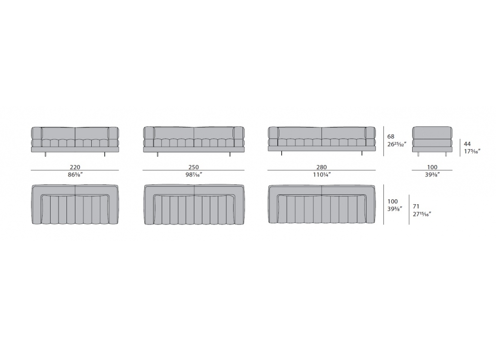 | Dimensioni | 220 x 100 x H 68 cm; 250 x 100 x H 68 cm; 280 x 100 x H 68 cm. |