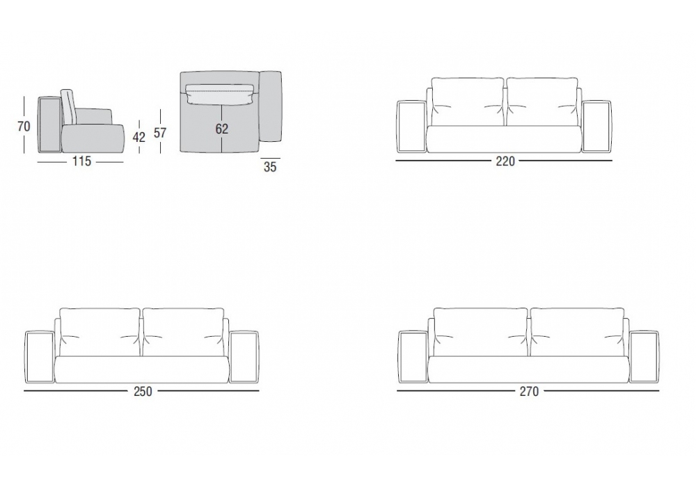 | Dimensioni | - 220 x 115 x H 70 cm; - 250 x 115 x H 70 cm; - 270 x 115 x H 70 cm. |