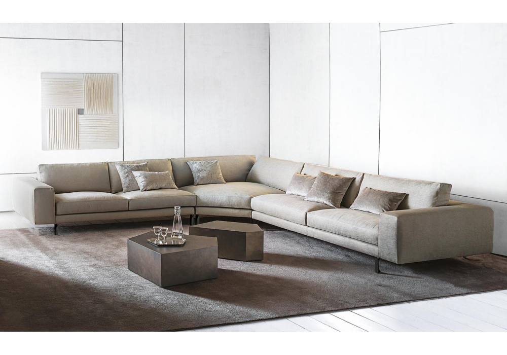 Hampton firmato da Castello Lagravinese per Casamilano è un divano modulare con struttura in massello di abete, multistrato di pioppo e pannelli in particelle di legno. Imbottitura in poliuretano espanso a densità differenziata e rivestimento in tessuto o pelle. Piedi in metallo verniciato nero.