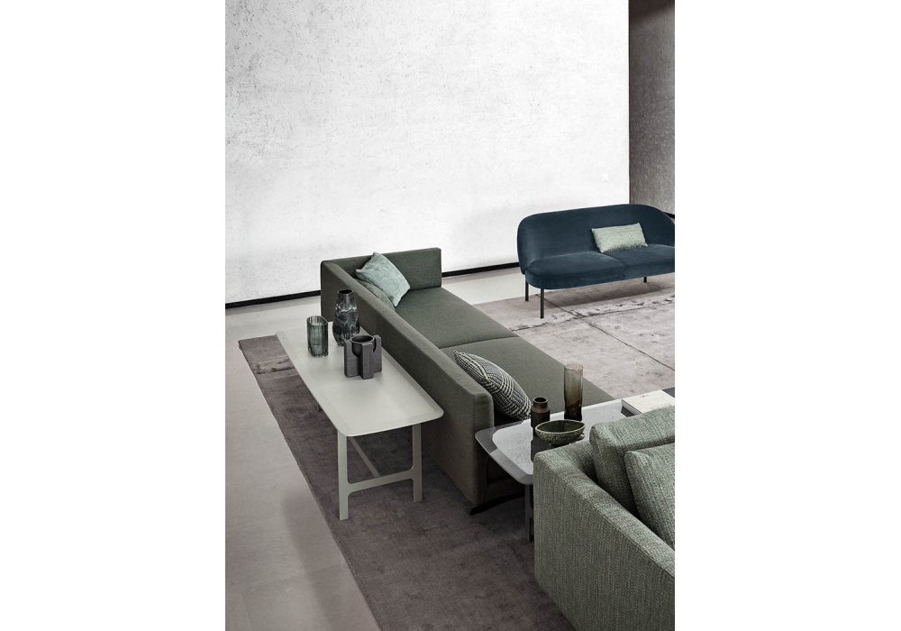 Copenaghen firmato da Enrico Cesana per Alf Dafrè è un divano modulare con struttura in fusto di legno con piano cinghiato, imbottitura in poliuretno espanso a densità differenziata. Rivestimento in differenti pelli, tessuti o ecopelli. Base in metallo verniciato.