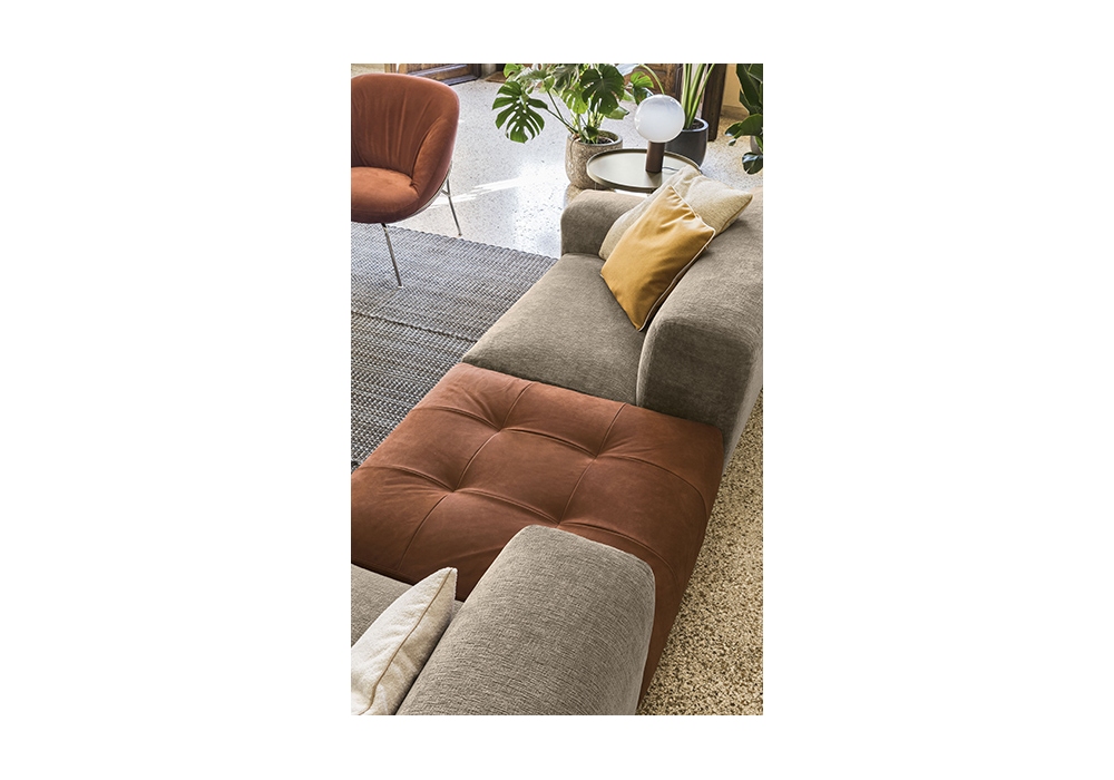 Delano Up firmato da Pier Luigi Frighetto per Pianca è un divano modulare realizzato con rivestimento in tessuto, pelle o ecopelle. I moduli aggiuntivi, il pouf quadrato e trapuntato, il pouf triangolare, gli elementi terminali open e loveseat, permettono di creare una vasta gamma di configurazioni su misura, rispondendo a diverse esigenze funzionali e stilistiche.