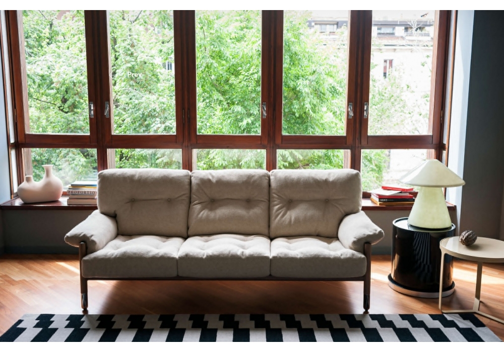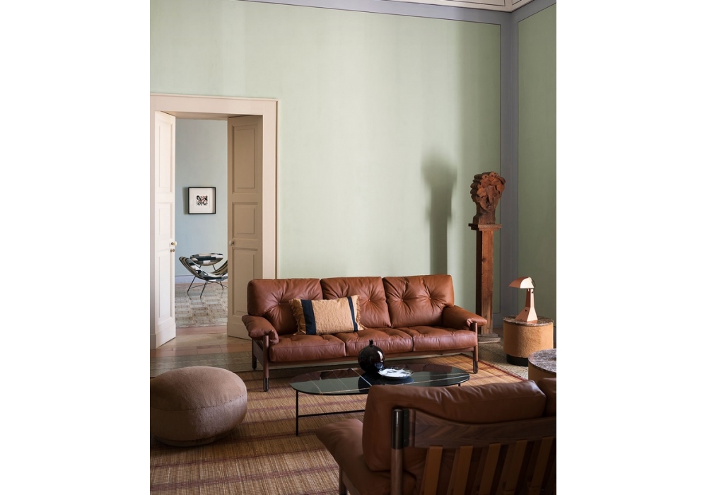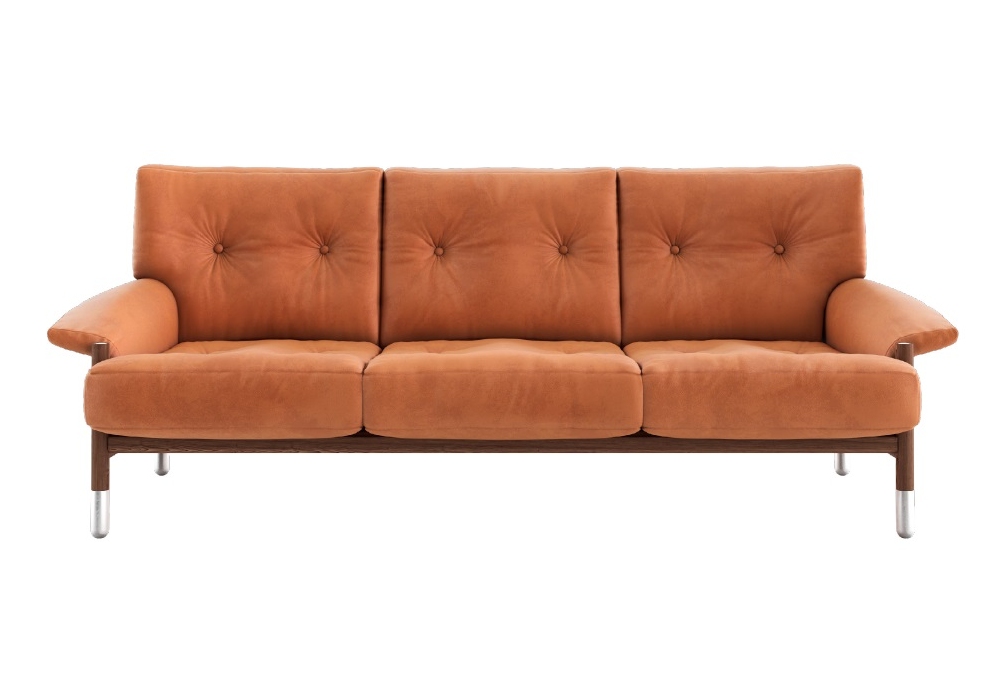 Sella firmato da Carlo De Carli per Tacchini è un divano con struttura in noce canaletto con cinture in cuoio. Imbottitura cuscini in piuma per il sedile, cuscini in piuma con inserto in gomma per lo schienale per dare sostegno. Dettagli in metallo nella finitura cromo nero lucido. Rivestimento in tessuto o pelle (non sfoderabile).
