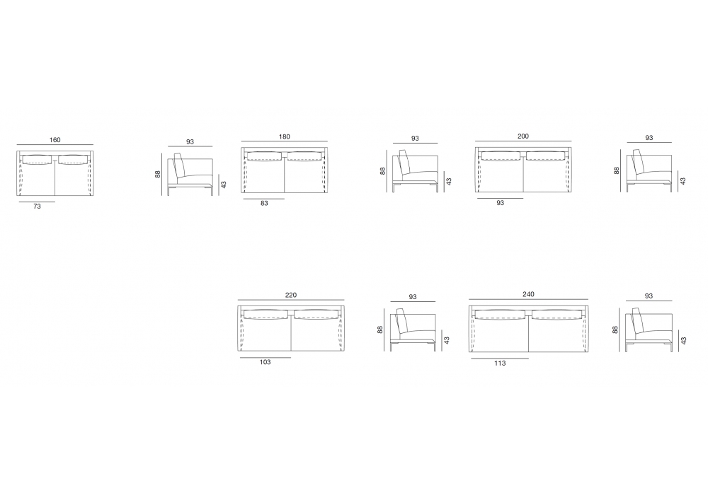 | Dimensioni | 160 x 93 x H 88 cm; 180 x 93 x H 88 cm; 200 x 93 x H 88 cm; 220 x 93 x H 88 cm; 240 x 93 x H 88 cm. |