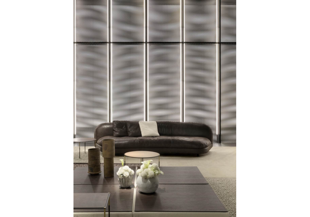 Gala firmato da David Lopez Quincoces per Living Divani è un divano con pieidni regolabili in acciaio verniciato nero opaco e rivestimento in tessuto o pelle.