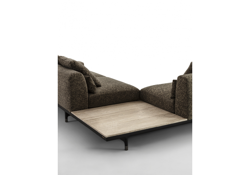 Argo XL firmato da D. Dolcini per Porada è un sistema di sedute modulari con base in massello di noce canaletta e puntali in cromo nero o ottone spazzolato. Le sedute, appoggiate su pannelli elastici in multistrato, sono imbottite in poliuretano espanso a densità differenziata con strato superiore in Memory Foam, mentre schienali e braccioli presentano struttura in multistrato con imbottitura dedicata. Il rivestimento è sfoderabile in tessuto e non sfoderabile in pelle. Completato da cuscini poggiareni opzionali in piuma d’oca canalizzata e da elementi integrabili come contenitori in noce canaletta con piani scorrevoli in legno e vetro fumé e tavolini con piano in marmo.