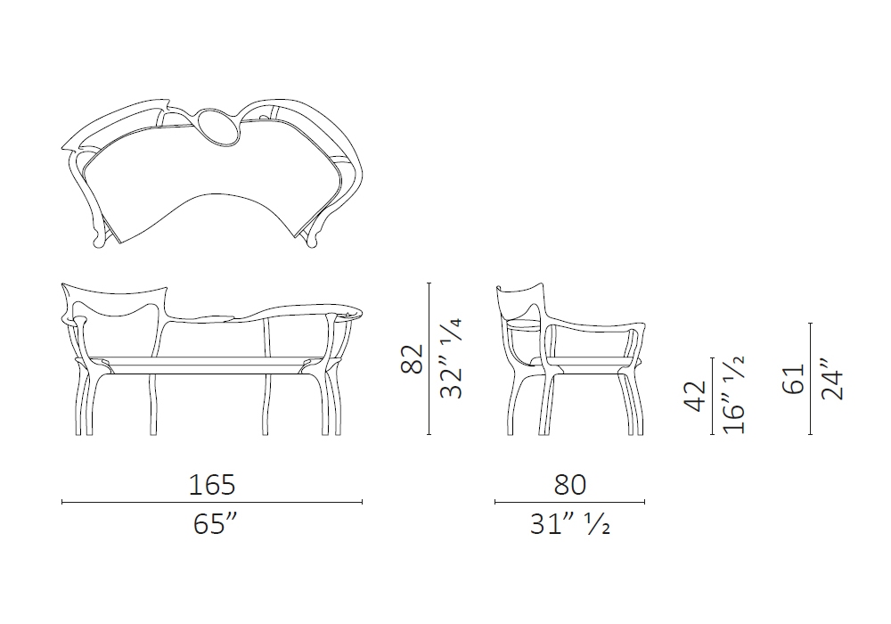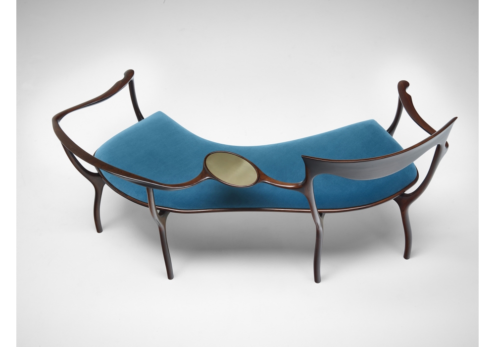 D.R.D.P. di Ceccotti Collezioni è un divanetto in legno massello di noce americano, seduta in multistrato imbottita. Vassoio con piano in vetro sabbiato argentato.