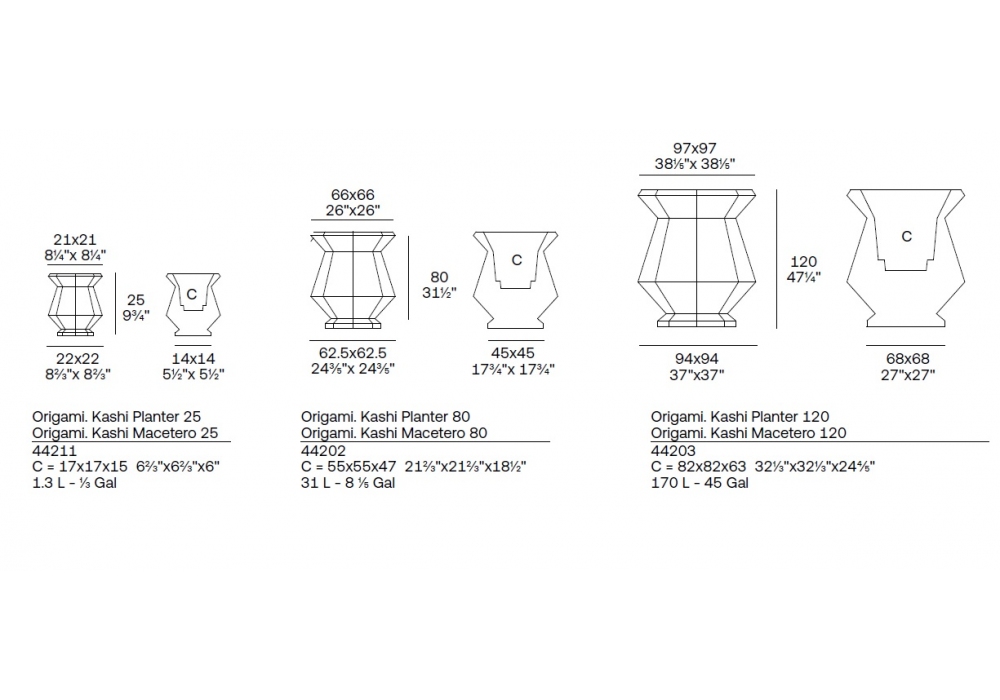 | Dimensioni | Ø 22 x H 25 cm; Ø 62.5 x H 80 cm; Ø 94 x H 120 cm. |