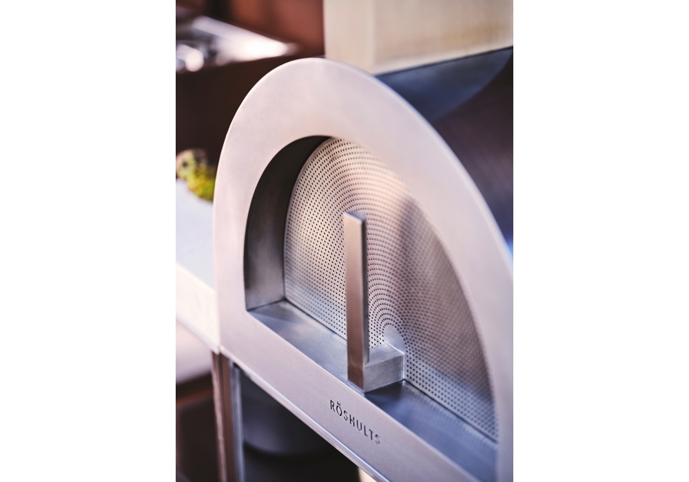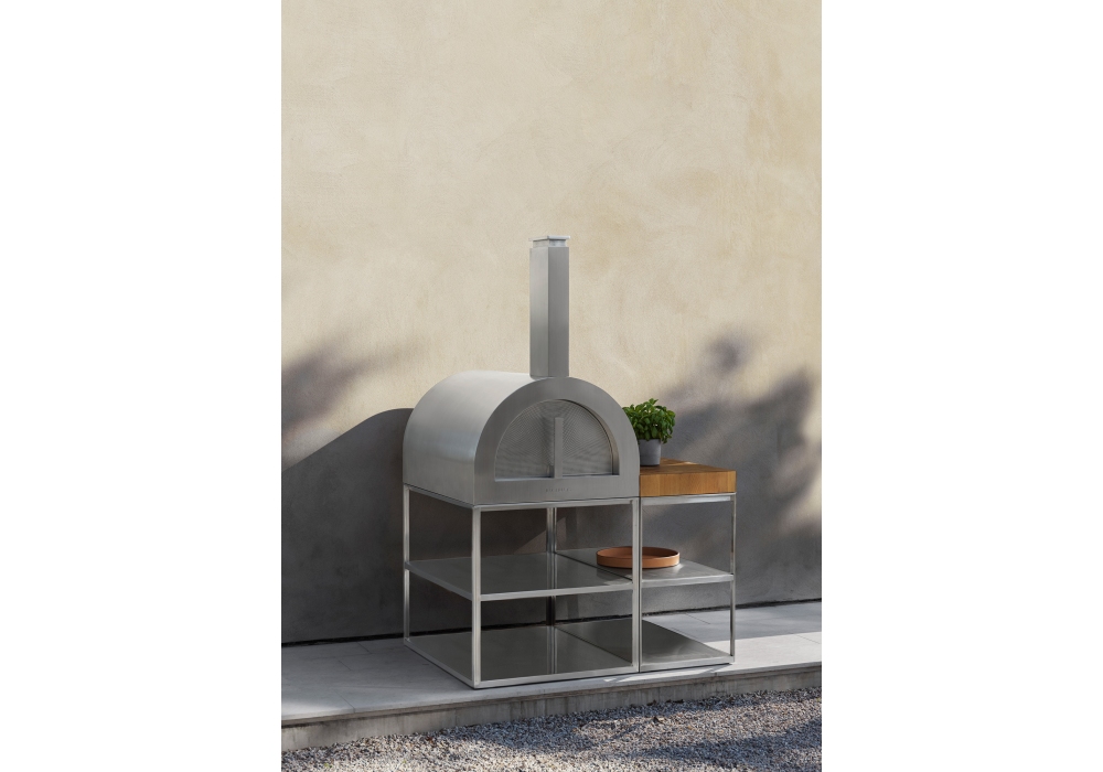 Wood Oven firmato da Broberg & Ridderstråle per Röshults è un forno a legna con struttura in acciaio inossidabile e piano inferiore removibile in teak. Su richiesta è possibile aggiunge delle strutture d'appoggio laterali.