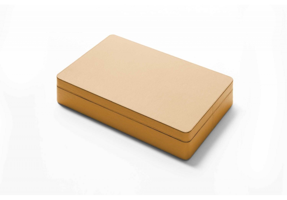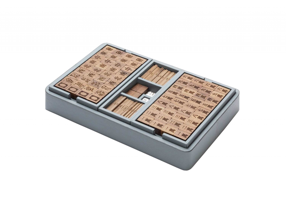 Il Mahjong disegnato da Giobagnara x Poltrona Frau è contenuto all'interno di una preziosa scatola di legno rivestita in Pelle Frau®, all'interno della quale si trovano 148 tessere in legno di noce, 244 bastoncini in legno di noce, 4 dadi in plexiglass opaco standard, 1 dado in plexiglass opaco (con le iniziali del punti cardinali sulle sue facce), 4 vassoi per contenere le tessere e 1 vassoio per contenere i dadi e i bastoncini.
