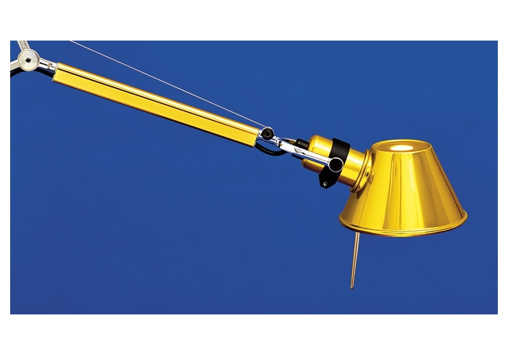 Tolomeo Micro Gold firmata da Michele De Lucchi & Giancarlo Fassina per Artemide è una lampada da tavolo nella nuova finitura oro. Base e struttura a bracci mobili in alluminio lucidato; diffusore in alluminio anodizzato; snodi e supporti in alluminio brillantato.