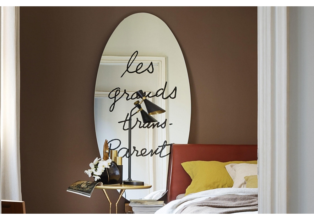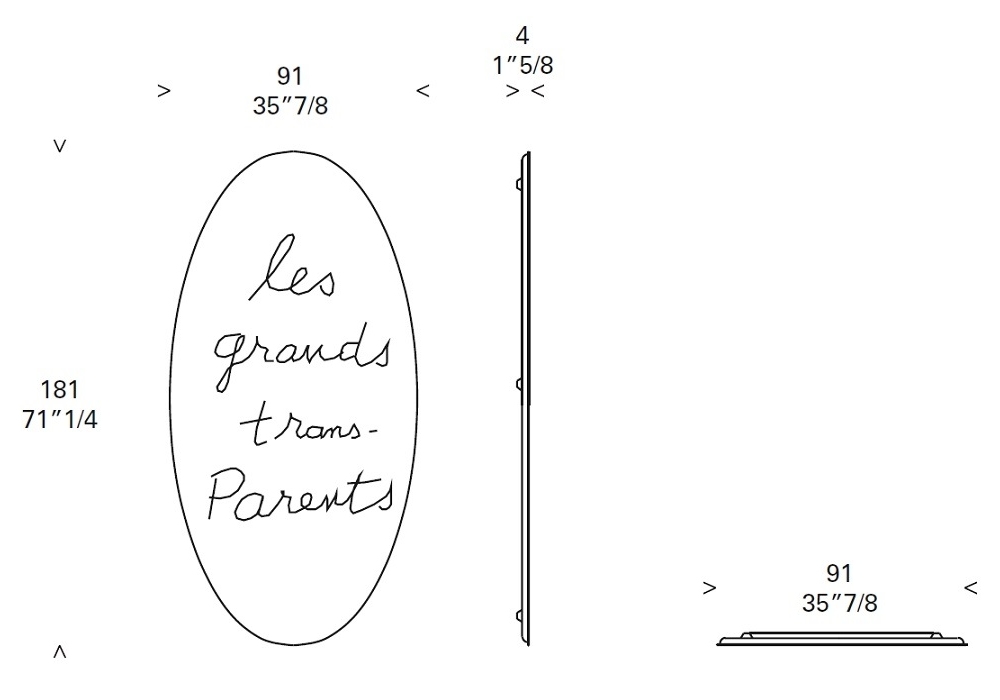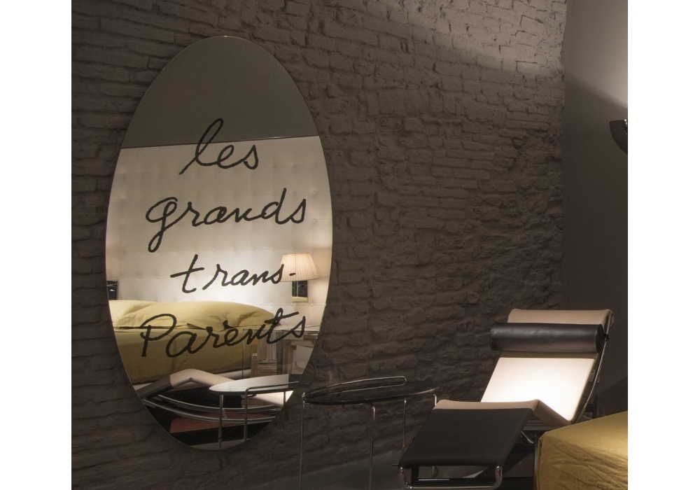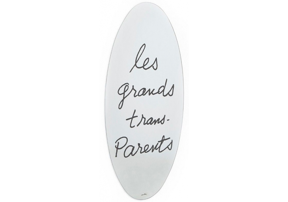 Les Grands Trans-Parents firmato da Man Ray per Cassina è uno specchio ellittico serigrafato con supporto in poliuretano rigido. Produzione in serie dell'opera originale di Man Ray del 1938: un gioco di parole scritto su uno specchio più grande.