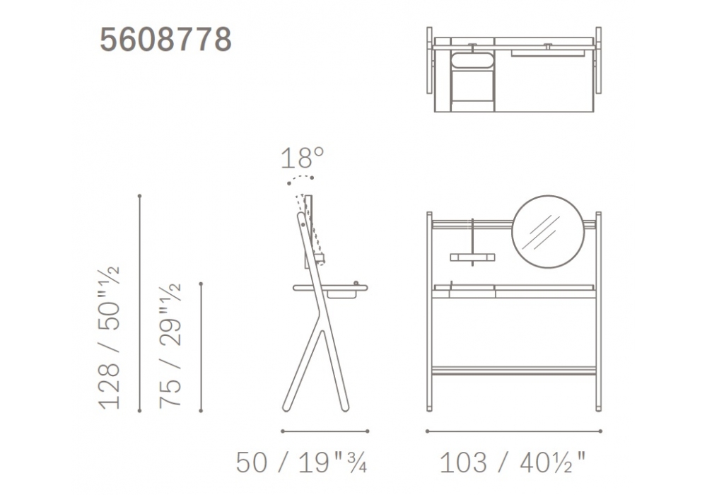 Ren firmata da Neri & Hu per Poltrona Frau è una toeletta con uno specchio rotondo, una vaschetta contenitore ovale e un piano d'appoggio in cui è ricavata una seconda vaschetta con anta a ribaltina in cuoio Saddle Extra Polvere e maniglia a forma di anello in ottone.