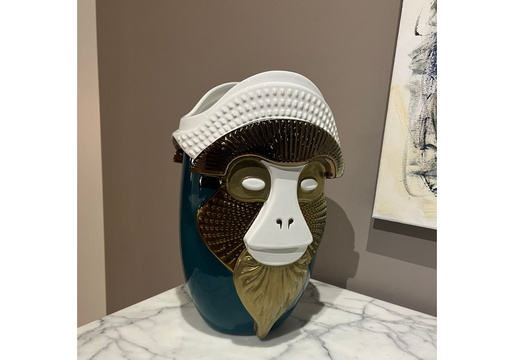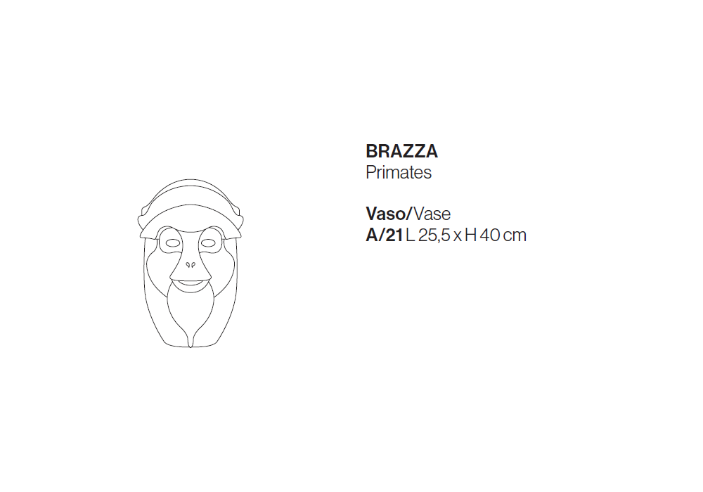 Primates Brazza firmato da Elena Salmistraro per Bosa è un vaso in ceramica arricchito con smalti colorati e metalli preziosi, in stile moderno, che riproduce le livree delle scimmie attraverso la vivacità di colori e riporta questo animale nel nostro ambiente domestico per sedurci con la sua forza vitale.