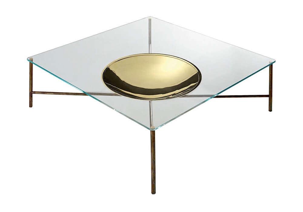 Golden Moon firmato da Massimo Castagna per Gallotti & Radice è un tavolino con piano in vetro temperato trasparente extralight, struttura in ottone brunito a mano e piattino in ottone lucido.