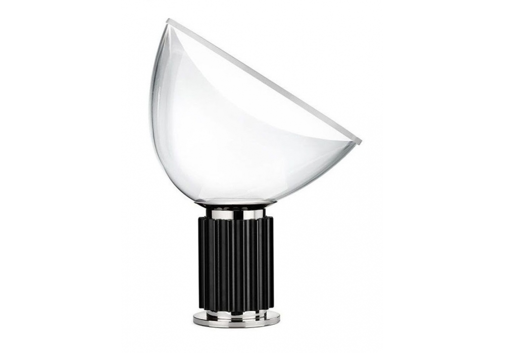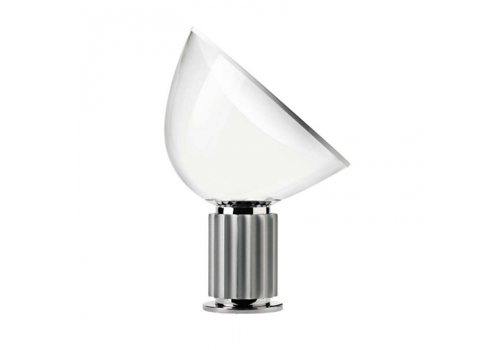 Taccia LED firmata da Achille & Pier Giacomo Castiglioni per Flos è una lampada da tavolo a luce indiretta e riflessa. Riflettore in alluminio verniciato bianco lucido all'esterno e bianco opaco all'interno. Diffusore orientabile in vetro soffiato trasparente. Corpo in alluminio estruso.