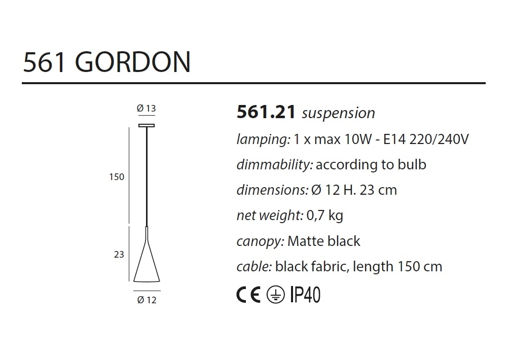 561 Gordon firmata da Corrado Dotti per Tooy è una lampada a sospensione con struttura metallica verniciata a polveri epossidiche. Cono in metallo verniciato a polveri epossidiche o lavorato mediante trattamento galvanico. Diffusore in metacrilato.