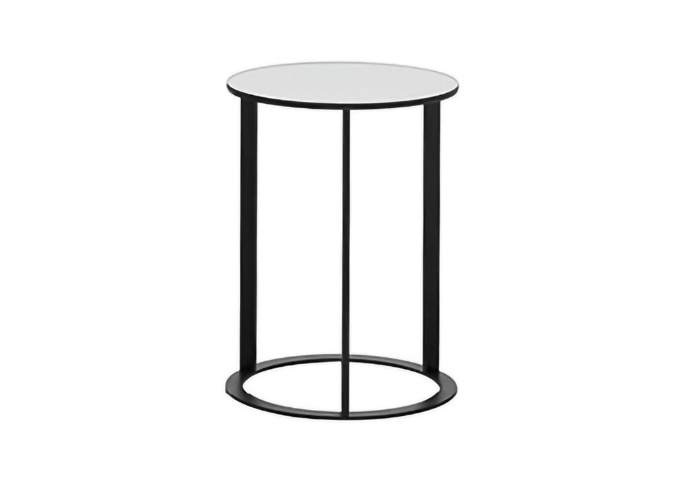 Elios firmato da Antonio Citterio per Maxalto è un tavolino con piano a specchio e struttura in acciaio verniciato nickel bronzato.