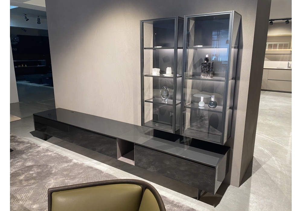 Pass-Word Evolution firmato da Dante Bonuccelli per Molteni&C è un sistema living realizzato con basamento in metallo finitura peltro, struttura in essenza cedro e fronatali, cassetti e ante a ribalta finitura peltro lucido. Le vetrine verticali appese sono realizzate con ante a battente in vetro trasparente e ripiani dotati di LED 3000°K .