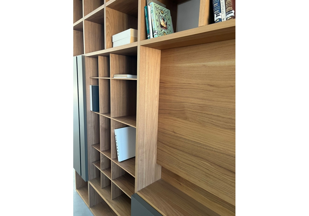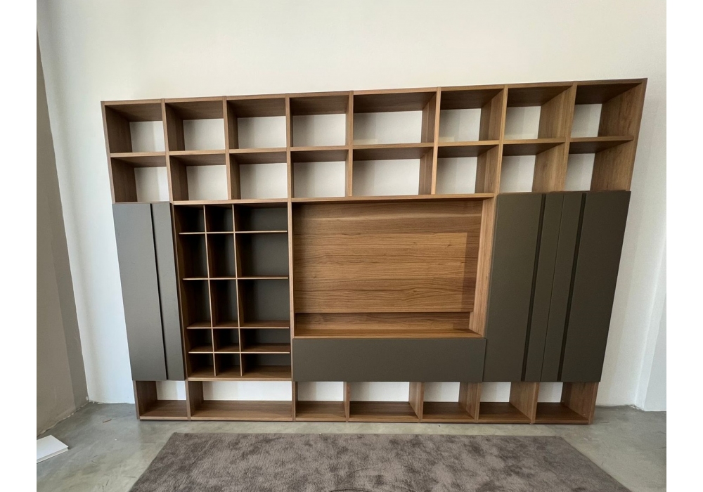 Selecta firmata da Lema è una parete attrezzata realizzata con struttura noce, fondali e facciata finitura Terra e maniglie push pull nere.