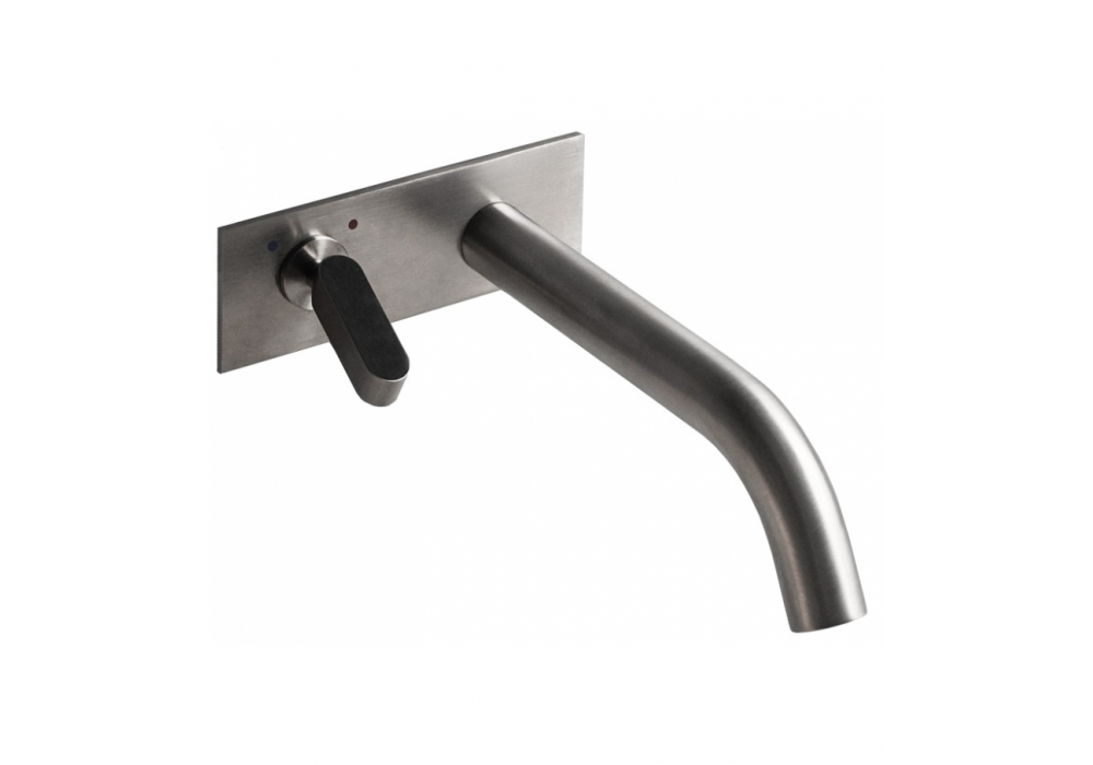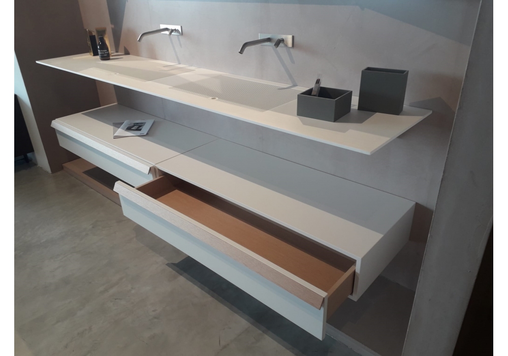 Sistema Bagno Agape composto da un piano autoportante realizzato in Corian® Glacier White con lavabi incassati e due rubinetti miscelatore da incasso a parete in acciao inox con monocomando joystick e bocca orizzontale. I contenitori sottostanti sono realizzati con struttura laccata bianca e maniglia in rovere naturale. Specchio con alette laterali incluso.