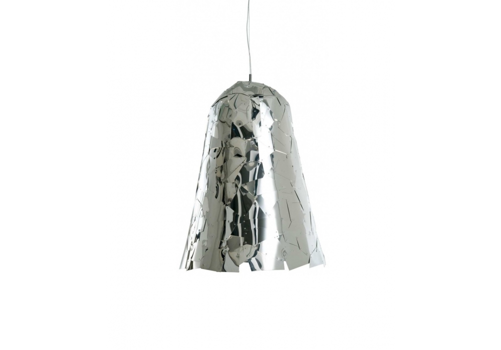 Campana firmata da Fernando e Humberto Campana per Edra è una lampada a sospensione a forma di campana realizzata con lastre di alluminio anodizzato lucido disponibile nella finitura argento.